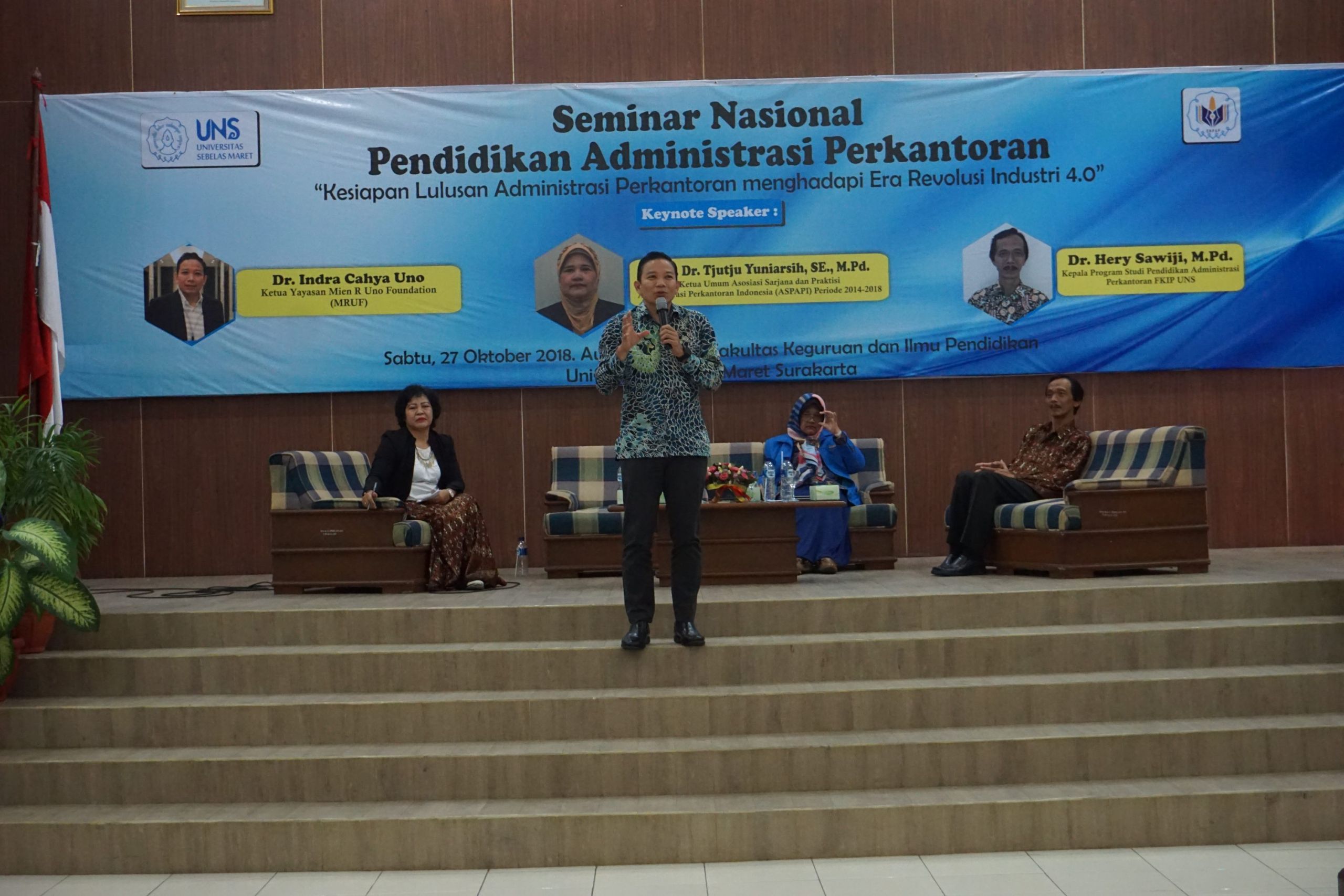Seminar Nasional dan Call for Papers Revolusi Industri 4.0 berlangsung pada Sabtu (27/10/2018) di Aula Fakultas Keguruan dan Ilmu Pendidikan Universitas Sebelas Maret. Seminar yang diselenggarakan Program Studi Pendidikan Administrasi Perkantoran (PAP) ini mengangkat tema “Kesiapan Lulusan Administrasi Perkantoran menghadapi Era Revolusi Industri 4.0”. Tema tersebut disesuaikan dengan perkembangan dunia guna menyiapkan seluruh pelaku bidang Administrasi Perkantoran dalam menjawab tantangan tersebut.